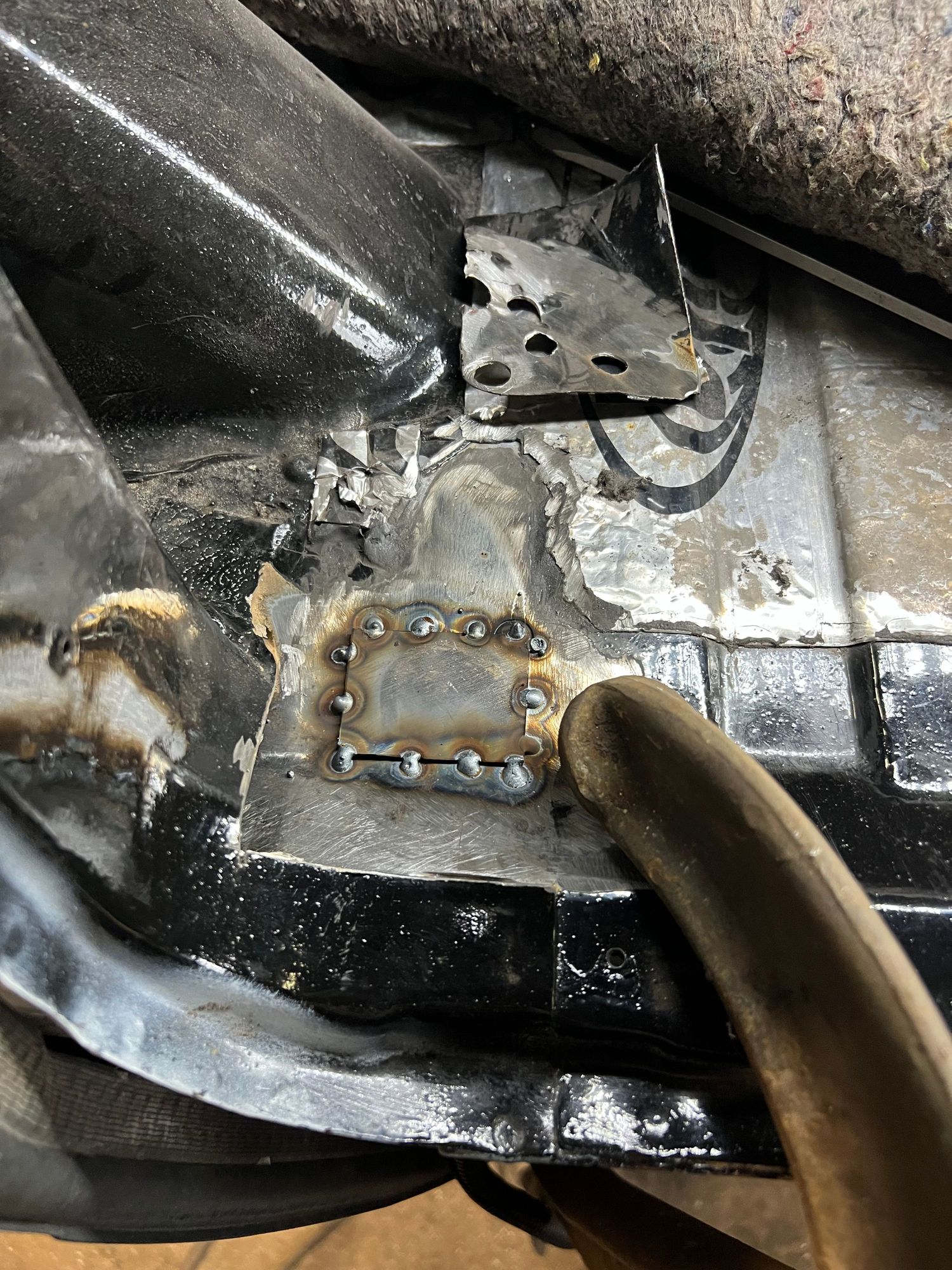 For this patch I used the “cut and butt” method. A patch is lapped over the damaged area and tacked in, then the edges are cut, pressed in flush and tacked a little at a time until the entire piece is flush.