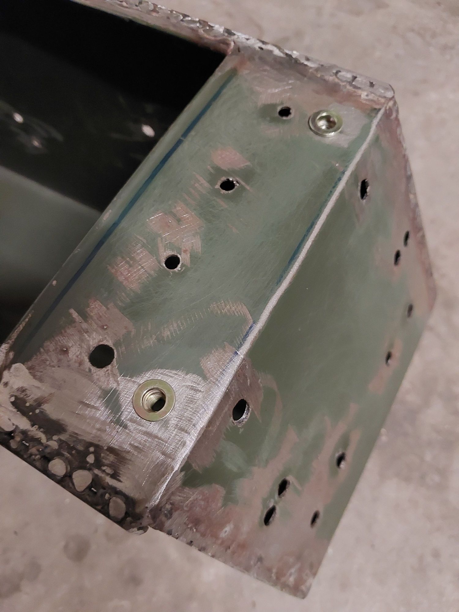 Drilled and popped some rivnuts into the front. This is where the black plastic insert will bolt to