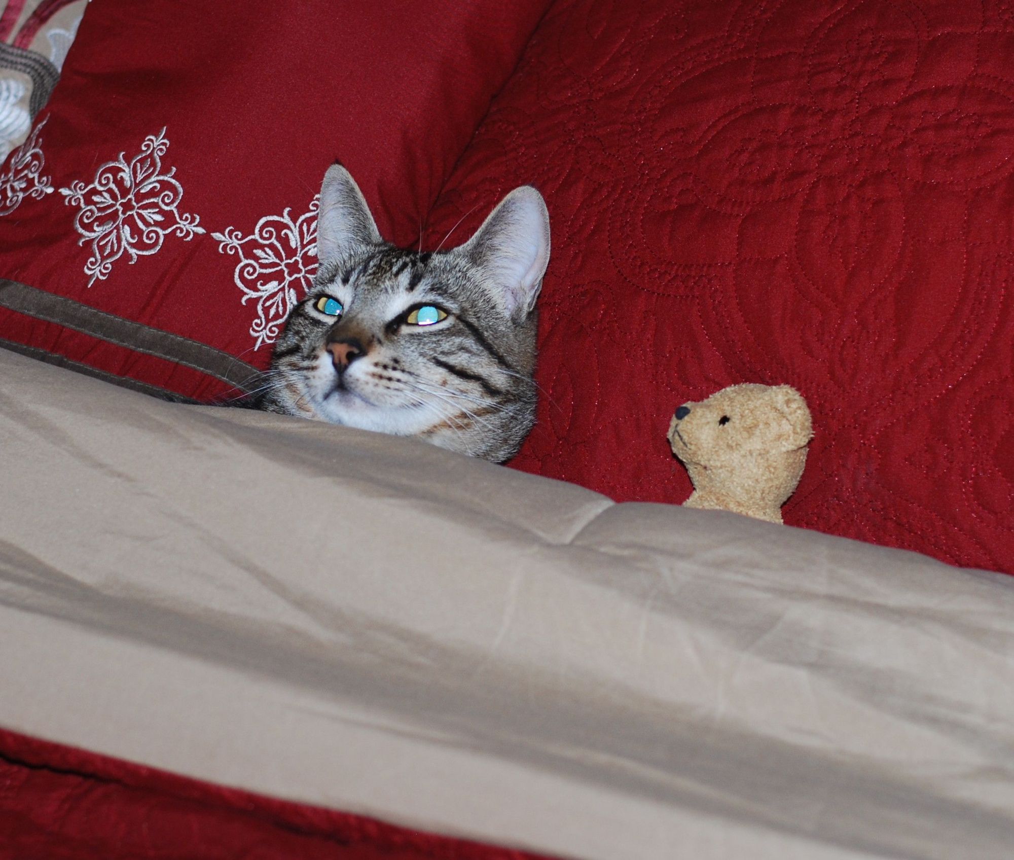 My cat Buddy and his little teddy bear. Ha ha maybe you should move when i make the bed next time!