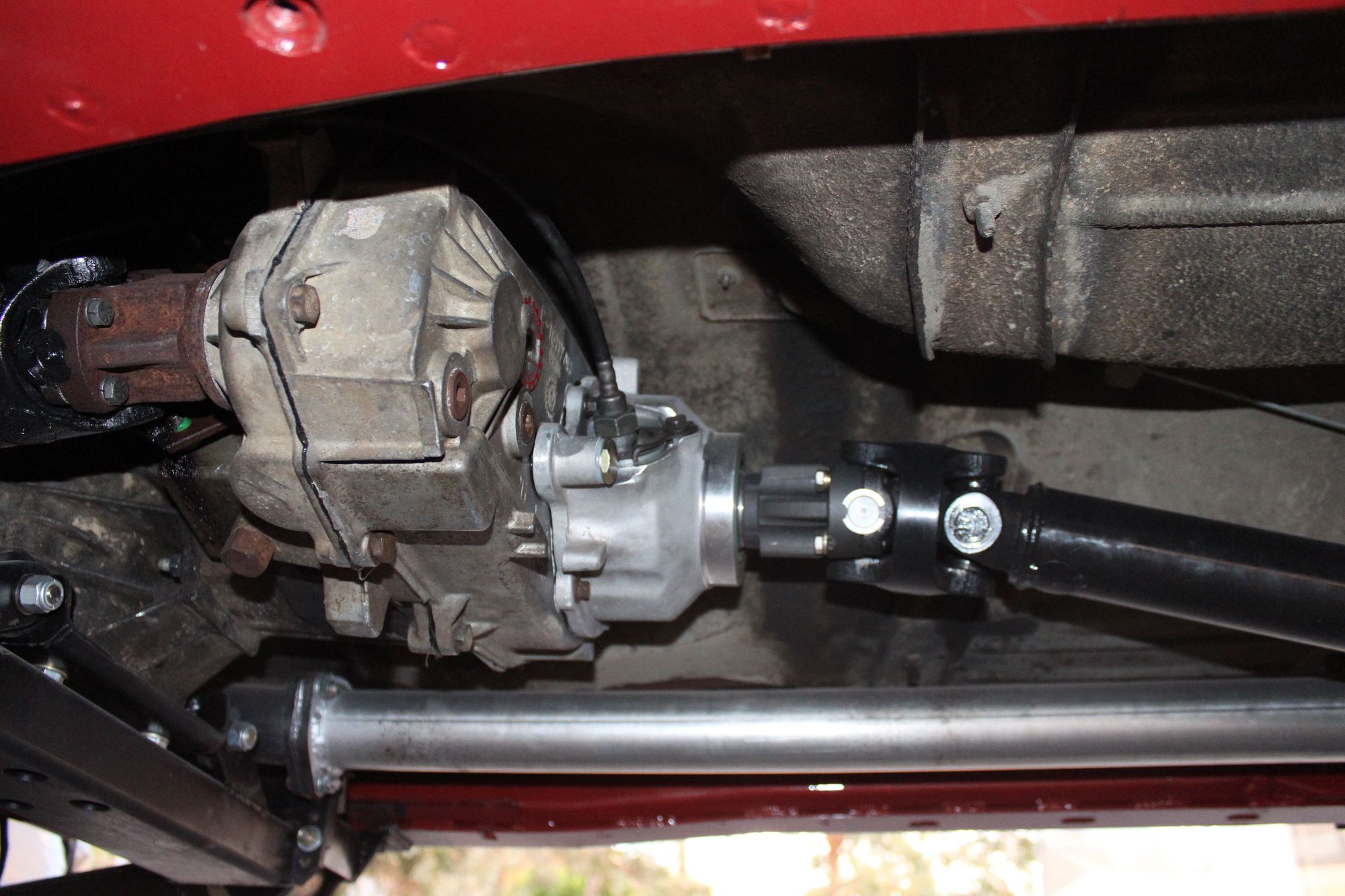 Slip yoke eliminator kit, new shift selector plate, 4WD linkage fabrication, shortened driveshaft, correct speedo calibration set up all done by M.I.T in El Cajon. I added 2 degree shims for the correct pinion angle and all is good!