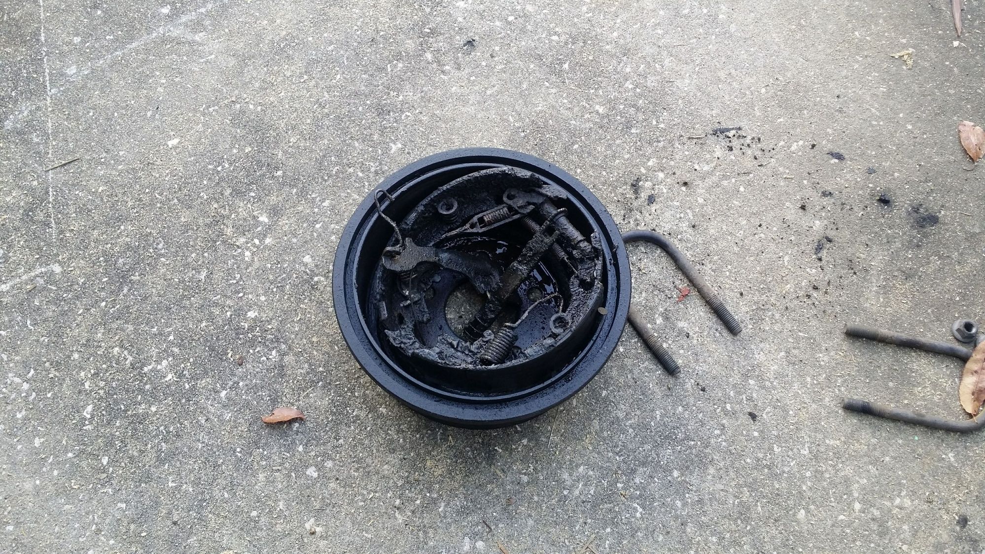 This is what the inside of the drum. Greasy, full of brake fluid, the shoes were worn so bad that the braking material was feathering off the shoe surface... kind of embarrassed I let them get that bad, but I've been procrastinating in anticipation of this swap.