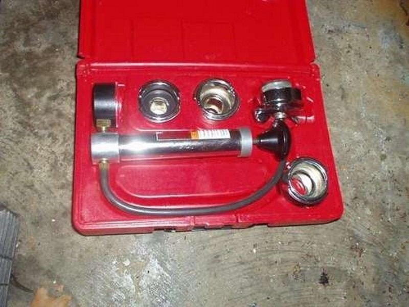 Look on top of the radiator cap for its rated pressure level. Remove the cap and install the pressure tester. Pressurize the system to just above the cap's rated pressure. The pressure level should hold for several minutes to confirm no leak is present. Search for coolant leaks once again while constant pressure is applied to the system.