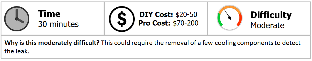 Examine above and below the engine for leaking coolant while the engine is off and running. If the leak is difficult to find, fluorescent dye can be added to the cooling system. A black light can then be used, which makes the dye glow.