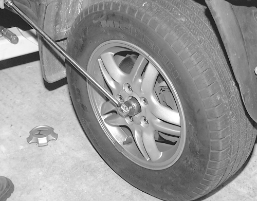- Using the tire iron, break free the lug nuts on the wheel.