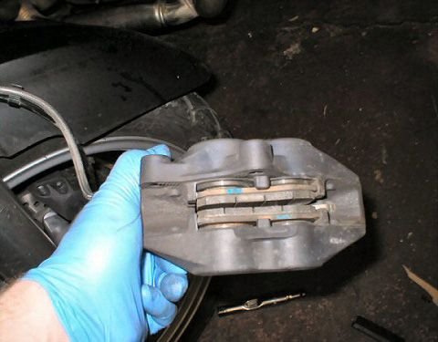 Remove the two half-inch bolts holding the caliper in place; one is on top and the second is on the bottom.
