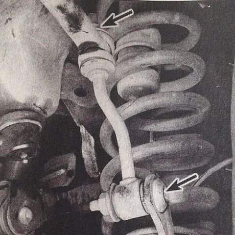 In order for the axle to be able to be freed up and be lowered far down enough, certain parts will have to be disconnected. One of these parts will be the stabilizer bar links. The easiest way to do this is to just remove the nut that secures the top of the link on the front bar's links, and the bottom of the link on the rear bar's links.